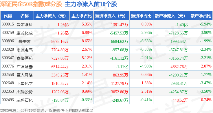 资金流向方面,深证民企50R(470057)指数成份股当日主力资金净流出合计162.33亿元,游资资金净流入合计47.48亿元,散户资金净流入合计114.84亿元。成份股资金流向详情见下表: