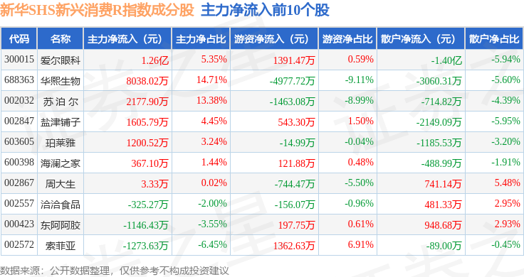 资金流向方面,新华SHS新兴消费R(489006)指数成份股当日主力资金净流出合计40.16亿元,游资资金净流入合计14.28亿元,散户资金净流入合计25.88亿元。成份股资金流向详情见下表: