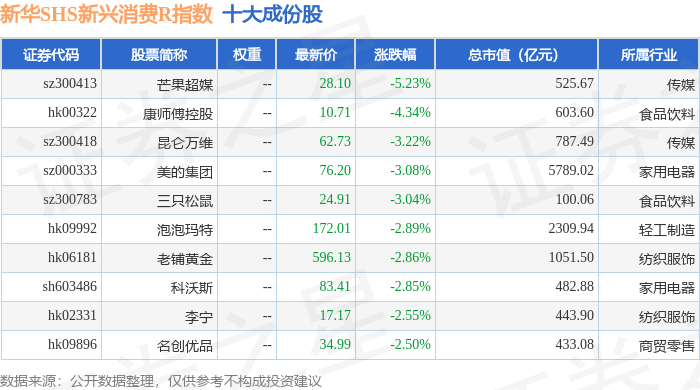 新华SHS新兴消费R(489006)指数十大成份股详情如下:
