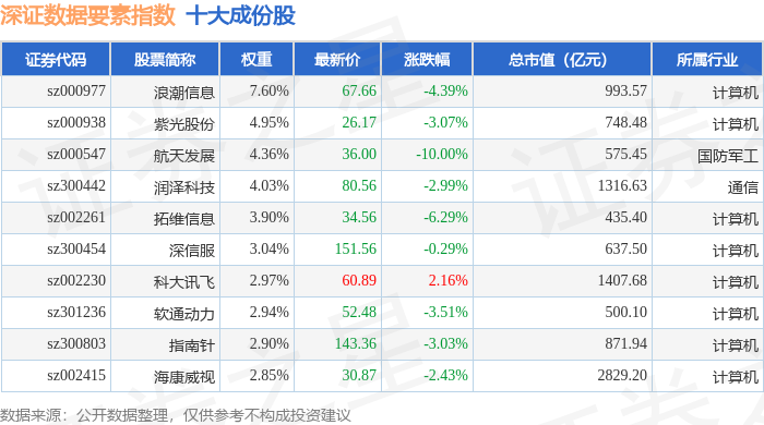 深证数据要素(970053)指数十大成份股详情如下: