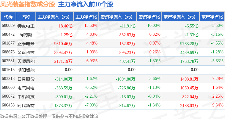 资金流向方面,风光装备(980026)指数成份股当日主力资金净流出合计76.15亿元,游资资金净流入合计8.85亿元,散户资金净流入合计67.3亿元。成份股资金流向详情见下表:
