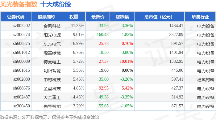 风光装备(980026)指数十大成份股详情如下: