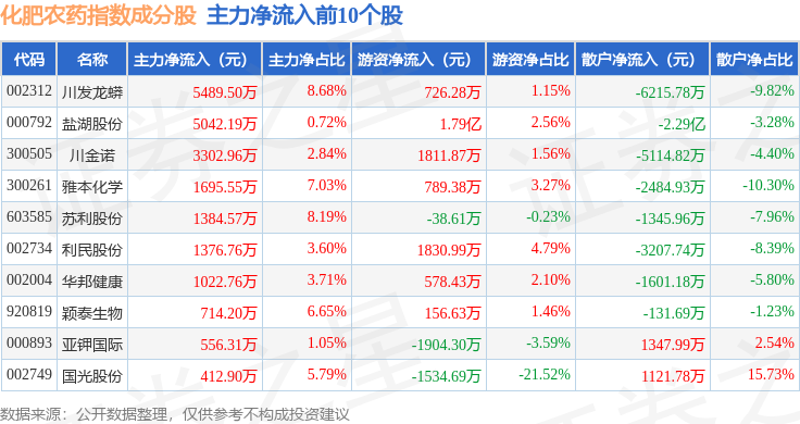 资金流向方面,化肥农药(980035)指数成份股当日主力资金净流出合计8.02亿元,游资资金净流入合计4.98亿元,散户资金净流入合计3.11亿元。成份股资金流向详情见下表: