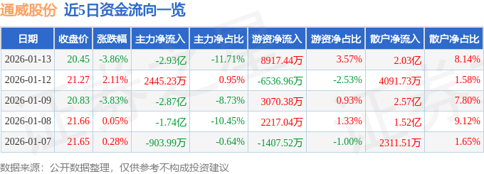 证券之星消息,截至2026年1月13日收盘,通威股份(600438)报收于20.45元,下跌3.86%,换手率2.69%,成交量120.99万手,成交额24.99亿元。