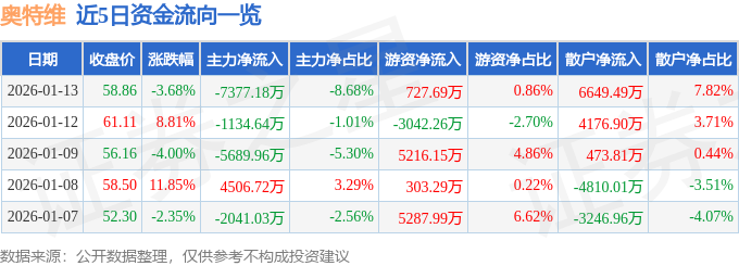 证券之星消息,截至2026年1月13日收盘,奥特维(688516)报收于58.86元,下跌3.68%,换手率4.67%,成交量14.7万手,成交额8.5亿元。