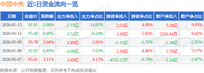 证券之星消息,截至2026年1月13日收盘,中国中免(601888)报收于91.91元,下跌3.66%,换手率2.86%,成交量55.86万手,成交额52.19亿元。