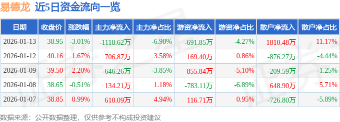 证券之星消息,截至2026年1月13日收盘,易德龙(603380)报收于38.95元,下跌3.01%,换手率2.56%,成交量4.11万手,成交额1.62亿元。
