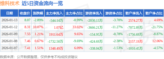 证券之星消息,截至2026年1月13日收盘,维科技术(600152)报收于8.07元,下跌2.89%,换手率12.72%,成交量67.32万手,成交额5.49亿元。