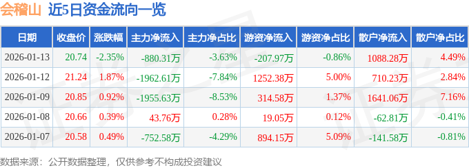 1月13日的资金流向数据方面,主力资金净流出880.31万元,占总成交额3.63%,游资资金净流出207.97万元,占总成交额0.86%,散户资金净流入1088.28万元,占总成交额4.49%。