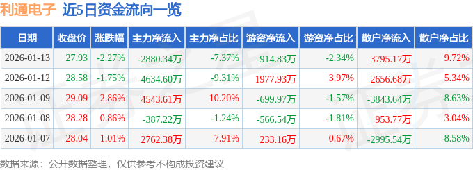 证券之星消息,截至2026年1月13日收盘,利通电子(603629)报收于27.93元,下跌2.27%,换手率5.4%,成交量13.85万手,成交额3.91亿元。