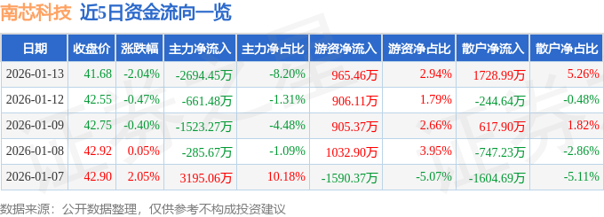 证券之星消息,截至2026年1月13日收盘,南芯科技(688484)报收于41.68元,下跌2.04%,换手率2.64%,成交量7.78万手,成交额3.29亿元。