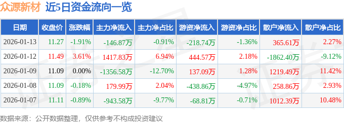 证券之星消息,截至2026年1月13日收盘,众源新材(603527)报收于11.27元,下跌1.91%,换手率4.48%,成交量14.2万手,成交额1.61亿元。