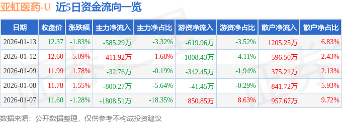 证券之星消息,截至2026年1月13日收盘,亚虹医药(688176)报收于12.37元,下跌1.83%,换手率3.23%,成交量14.09万手,成交额1.76亿元。
