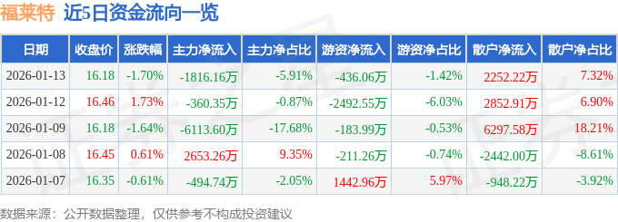 1月13日的资金流向数据方面,主力资金净流出1816.16万元,占总成交额5.91%,游资资金净流出436.06万元,占总成交额1.42%,散户资金净流入2252.22万元,占总成交额7.32%。