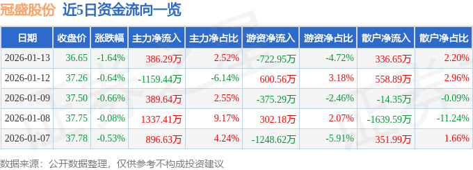 证券之星消息,截至2026年1月13日收盘,冠盛股份(605088)报收于36.65元,下跌1.64%,换手率2.07%,成交量4.14万手,成交额1.53亿元。