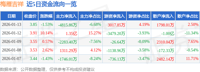 证券之星消息,截至2026年1月13日收盘,梅雁吉祥(600868)报收于3.85元,下跌1.53%,换手率9.77%,成交量185.38万手,成交额7.21亿元。