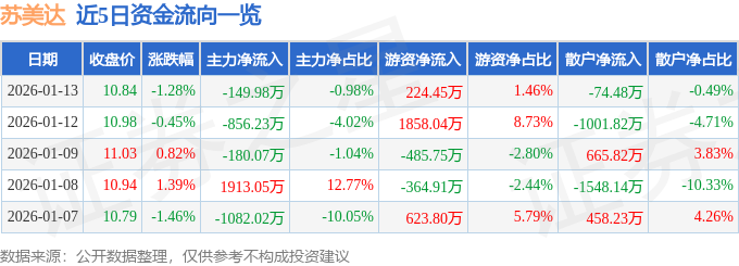 证券之星消息,截至2026年1月13日收盘,苏美达(600710)报收于10.84元,下跌1.28%,换手率1.08%,成交量14.11万手,成交额1.54亿元。