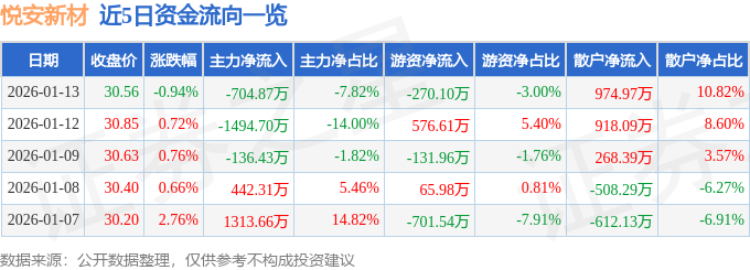 证券之星消息,截至2026年1月13日收盘,悦安新材(688786)报收于30.56元,下跌0.94%,换手率2.04%,成交量2.93万手,成交额9008.11万元。