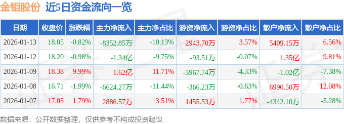 1月13日的资金流向数据方面,主力资金净流出8352.85万元,占总成交额10.13%,游资资金净流入2943.7万元,占总成交额3.57%,散户资金净流入5409.15万元,占总成交额6.56%。