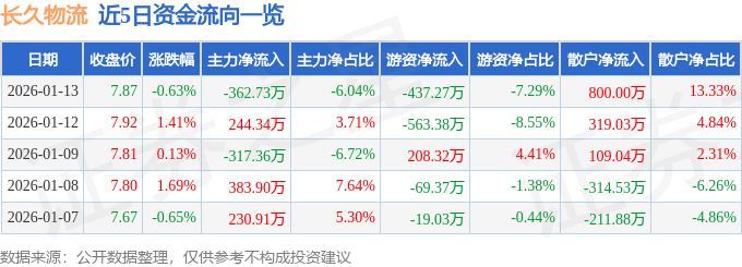 证券之星消息,截至2026年1月13日收盘,长久物流(603569)报收于7.87元,下跌0.63%,换手率1.26%,成交量7.58万手,成交额6000.64万元。