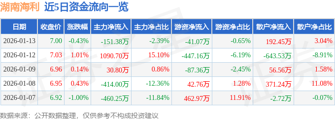 证券之星消息,截至2026年1月13日收盘,湖南海利(600731)报收于7.0元,下跌0.43%,换手率1.66%,成交量8.99万手,成交额6322.66万元。