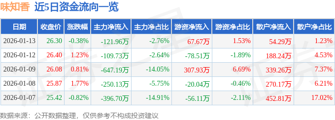 证券之星消息,截至2026年1月13日收盘,味知香(605089)报收于26.3元,下跌0.38%,换手率1.21%,成交量1.67万手,成交额4412.08万元。