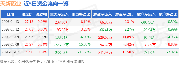 证券之星消息,截至2026年1月13日收盘,天新药业(603235)报收于27.12元,上涨0.26%,换手率0.24%,成交量1.06万手,成交额2895.98万元。