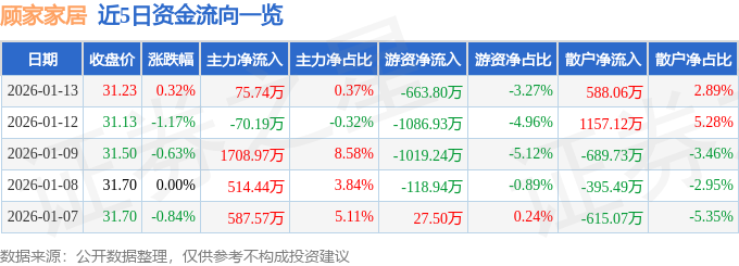 证券之星消息,截至2026年1月13日收盘,顾家家居(603816)报收于31.23元,上涨0.32%,换手率0.8%,成交量6.46万手,成交额2.03亿元。
