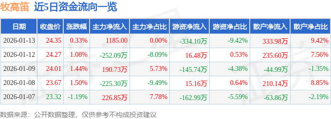 1月13日的资金流向数据方面,主力资金净流入0.12万元,占总成交额0.0%,游资资金净流出334.1万元,占总成交额9.42%,散户资金净流入333.98万元,占总成交额9.42%。