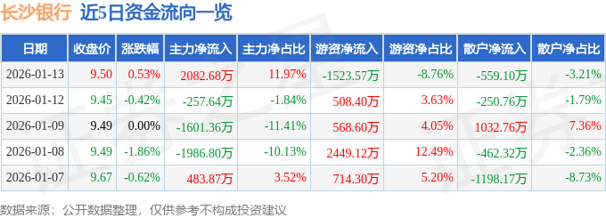 证券之星消息,截至2026年1月13日收盘,长沙银行(601577)报收于9.5元,上涨0.53%,换手率0.46%,成交量18.31万手,成交额1.74亿元。