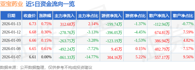 证券之星消息,截至2026年1月13日收盘,亚宝药业(600351)报收于6.73元,上涨0.75%,换手率3.13%,成交量21.64万手,成交额1.46亿元。