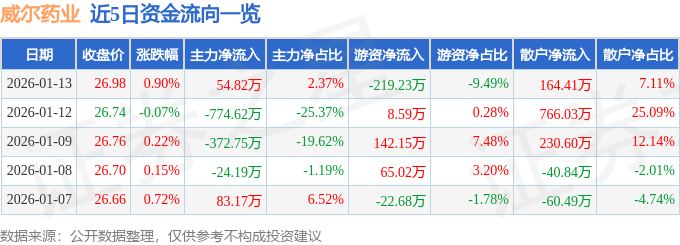 证券之星消息,截至2026年1月13日收盘,威尔药业(603351)报收于26.98元,上涨0.9%,换手率0.63%,成交量8560.0手,成交额2311.07万元。
