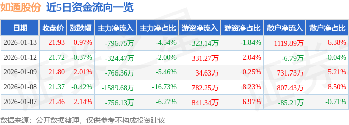 证券之星消息,截至2026年1月13日收盘,如通股份(603036)报收于21.93元,上涨0.97%,换手率3.85%,成交量7.92万手,成交额1.76亿元。