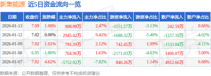 证券之星消息,截至2026年1月13日收盘,新集能源(601918)报收于7.09元,上涨1.0%,换手率2.0%,成交量51.77万手,成交额3.68亿元。
