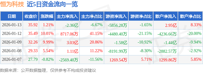 证券之星消息,截至2026年1月13日收盘,恒为科技(603496)报收于35.92元,上涨1.21%,换手率29.77%,成交量95.34万手,成交额35.43亿元。