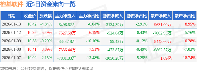 证券之星消息,截至2026年1月13日收盘,榕基软件(002474)报收于10.42元,下跌4.84%,换手率18.97%,成交量100.68万手,成交额10.76亿元。