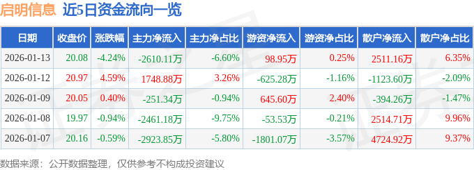 证券之星消息,截至2026年1月13日收盘,启明信息(002232)报收于20.08元,下跌4.24%,换手率4.75%,成交量19.42万手,成交额3.96亿元。