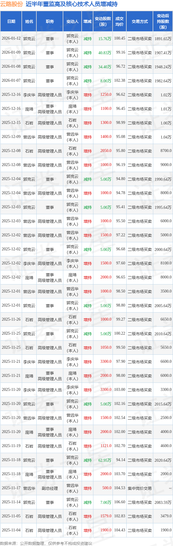 云路股份近半年内的董监高及核心技术人员增减持详情如下: