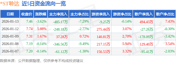 证券之星消息,截至2026年1月13日收盘,*ST聆达(300125)报收于7.46元,下跌3.62%,换手率2.44%,成交量8.79万手,成交额6651.26万元。