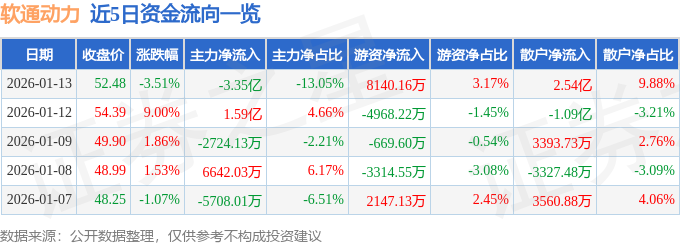 证券之星消息,截至2026年1月13日收盘,软通动力(301236)报收于52.48元,下跌3.51%,换手率6.13%,成交量47.99万手,成交额25.68亿元。