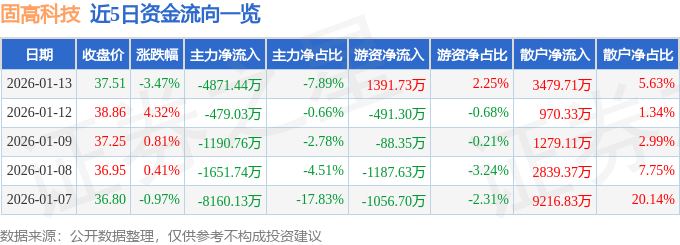 证券之星消息,截至2026年1月13日收盘,固高科技(301510)报收于37.51元,下跌3.47%,换手率5.8%,成交量16.19万手,成交额6.18亿元。