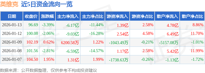 证券之星消息,截至2026年1月13日收盘,英维克(002837)报收于96.69元,下跌3.39%,换手率6.39%,成交量54.36万手,成交额53.93亿元。