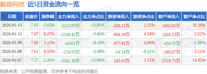 证券之星消息,截至2026年1月13日收盘,毅昌科技(002420)报收于7.63元,下跌3.05%,换手率5.34%,成交量21.35万手,成交额1.65亿元。