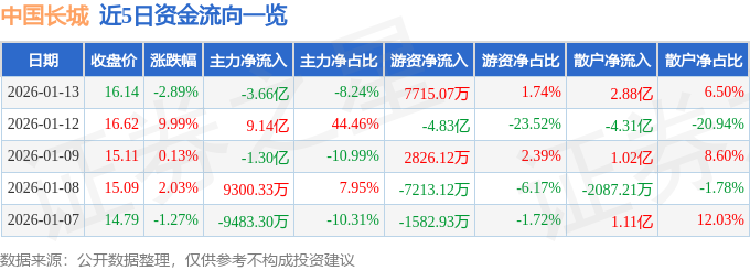 1月13日的资金流向数据方面,主力资金净流出3.66亿元,占总成交额8.24%,游资资金净流入7715.07万元,占总成交额1.74%,散户资金净流入2.88亿元,占总成交额6.5%。