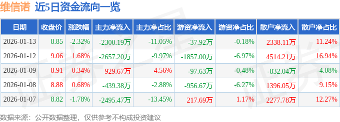 证券之星消息,截至2026年1月13日收盘,维信诺(002387)报收于8.85元,下跌2.32%,换手率1.67%,成交量23.28万手,成交额2.08亿元。
