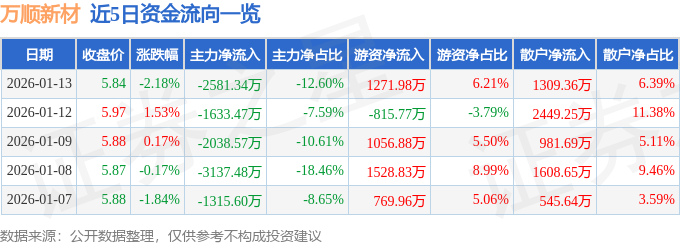 证券之星消息,截至2026年1月13日收盘,万顺新材(300057)报收于5.84元,下跌2.18%,换手率4.78%,成交量34.69万手,成交额2.05亿元。