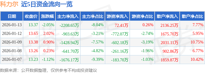证券之星消息,截至2026年1月13日收盘,科力尔(002892)报收于13.37元,下跌2.05%,换手率4.21%,成交量20.34万手,成交额2.75亿元。