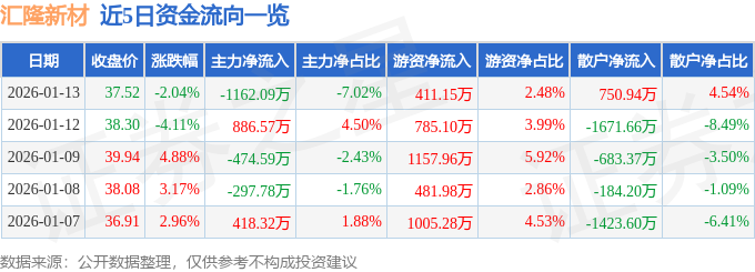 证券之星消息,截至2026年1月13日收盘,汇隆新材(301057)报收于37.52元,下跌2.04%,换手率5.26%,成交量4.34万手,成交额1.65亿元。