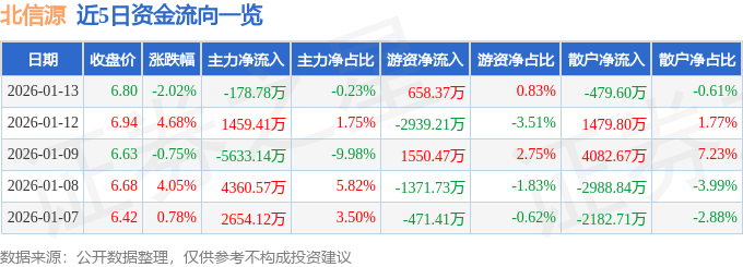 证券之星消息,截至2026年1月13日收盘,北信源(300352)报收于6.8元,下跌2.02%,换手率9.02%,成交量115.16万手,成交额7.91亿元。