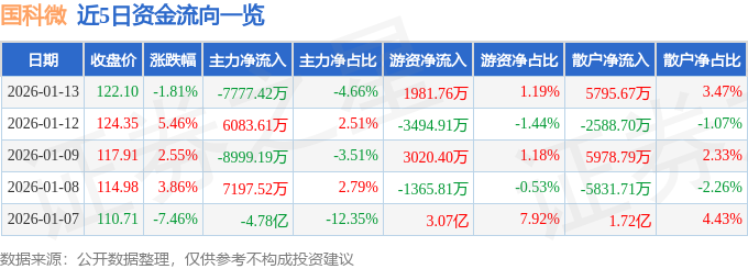 证券之星消息,截至2026年1月13日收盘,国科微(300672)报收于122.1元,下跌1.81%,换手率6.4%,成交量13.46万手,成交额16.69亿元。